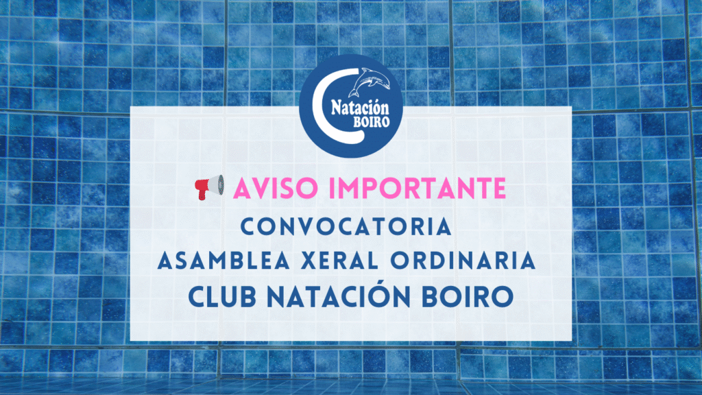 CONVOCATORIA DA ASAMBLEA XERAL ORDINARIA DO CLUBE NATACIÓN BOIRO De conformidade co establecido nos estatutos do Clube, convócase a tódolos socios e socias á Asamblea Xeral Ordinaria, que terá lugar no CENTRO SOCIAL DE ABANQUEIRO o sábado 27 de setembro ás 18:00 horas en primeira convocatoria e ás 18:30 en segunda e última convocatoria, coa